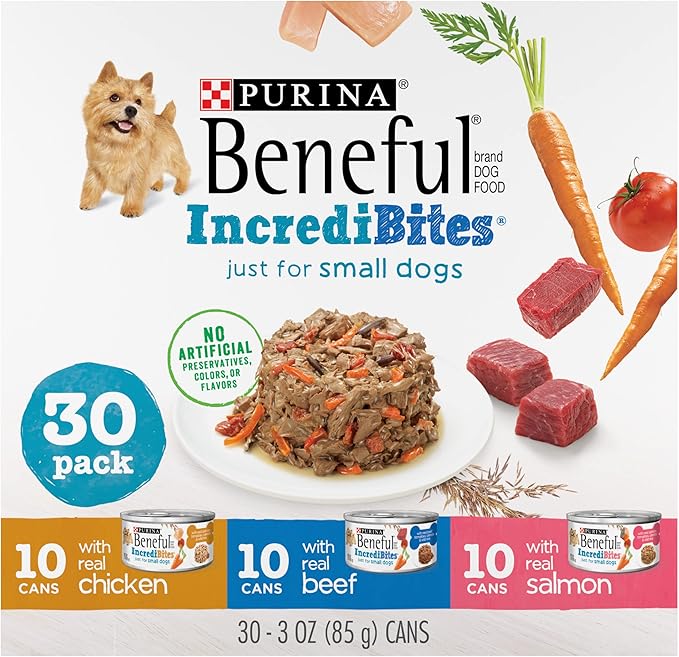 - Beneful IncrediBites variety pack made with real beef, chicken or salmon and real vegetables you can see formulated specifically for small dogs